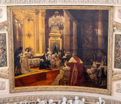 Der Auftrag für die Gemälde ging an die Künstler-Compagnie von Franz Matsch, Gustav und Ernst Klimt und war der erste große Staatsauftrag in Wien für die drei. Die Gemälde sind von 1886 bis 1888 entstanden, wobei die acht Gemälde an der Decke vorgegeben waren, die Segmentgemälde konnten die Künstler frei wählen. Außergewöhnlicherweise sind auch die Entwurfszeichnungen zu den Gemälden teilweise vorhanden – was einen schönen Einblick in die akribische Vorzeichnung von z.B. Gustav Klimt erlaubt! Der Auftrag wurde zur vollsten Zufriedenheit Kaiser Franz Josephs ausgeführt, der die Künstler neben dem Honorar mit dem Goldenen Verdienstkreuz auszeichnete – ein enormer Prestigegewinn für die junge Künstler-Compagnie.