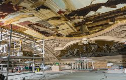 Bei unserem Besuch ist das Deckengemälde der rechten Feststiege schon fertig renoviert, das auf der linken Feststiege ist gerade in Arbeit.
