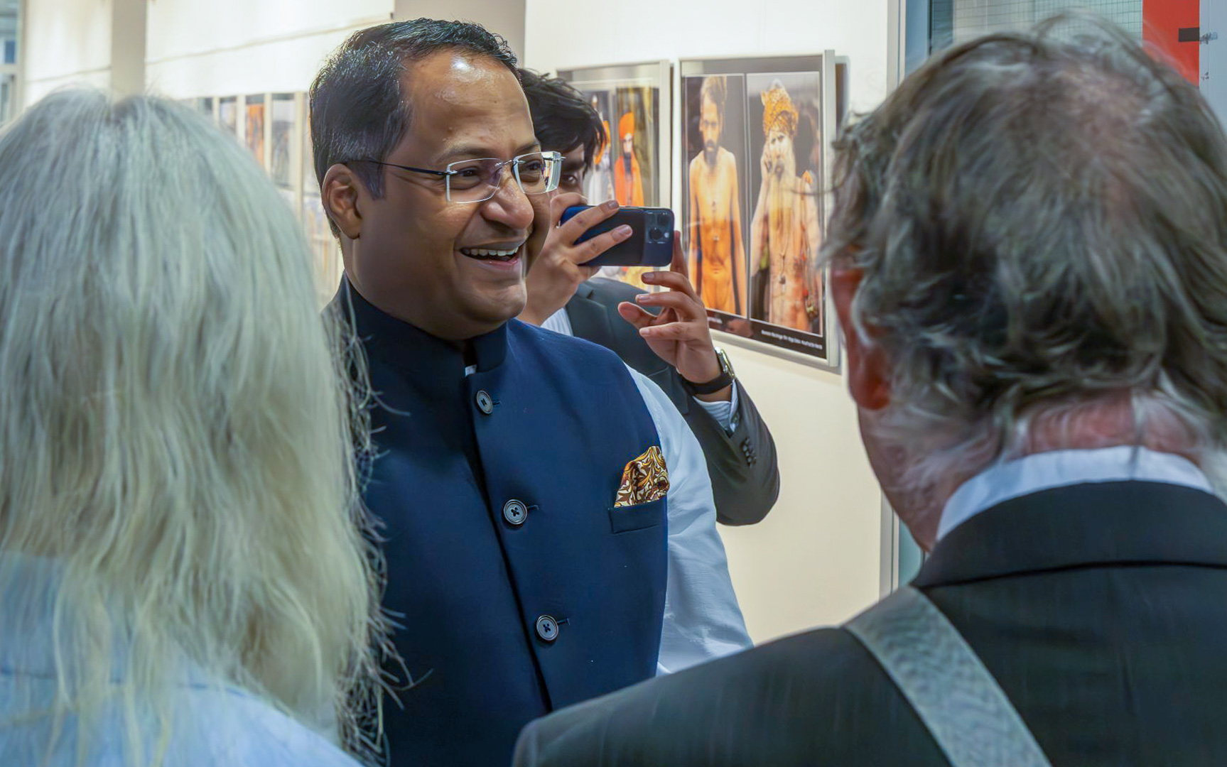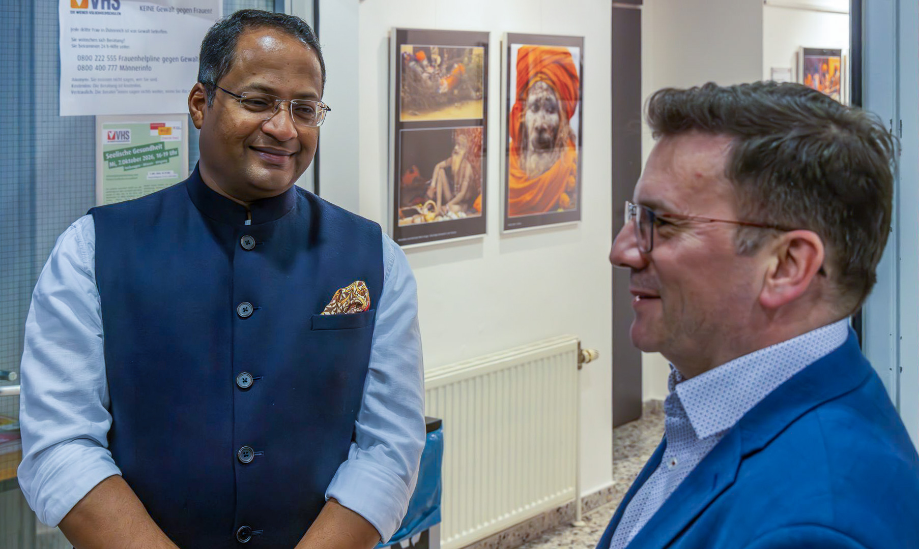 Am 16. Februar 2026 durften wir einen besonderen Gast begrüßen: der Botschafter der Republik Indien, Mr. Shambhu S. Kumaran, besuchte die Ausstellung! Herr Bezirksvorsteher Wilfried Zankl und VHS Dirketor Walter Schuster empfingen Herrn Kumaran und Begleitung. Einige der Reiseteilnehmer*innen und Fotograf*innen der Ausstellung, Wolfgang Ehrendorfer, Michael Weichinger und Rosmarie Weichinger-Ehn, erläuterten die Hintergründe der Reise 2025 zur Kumbh Mela und die Eindrücke, die sie als westliche Tourist*innen empfangen und mitgenommen hatten. Herr Kumaran zeigte sich beeindruckt von der Qualität der Bilder und gab auch einige Einblicke in die vielfältige Welt des Hinduismus und der anderen Religionen in Indien. Wolfgang Ehrendorfer steuerte die Fotos des Besuchs bei – herzlichen Dank dafür!