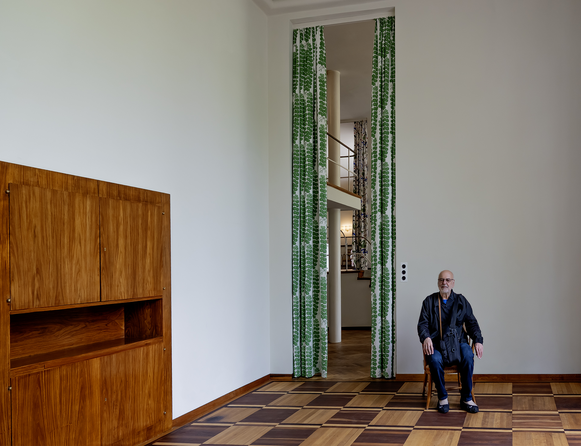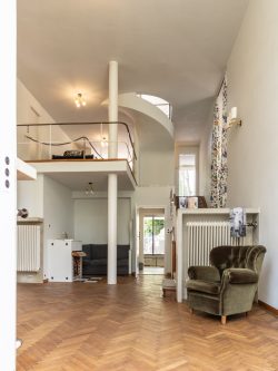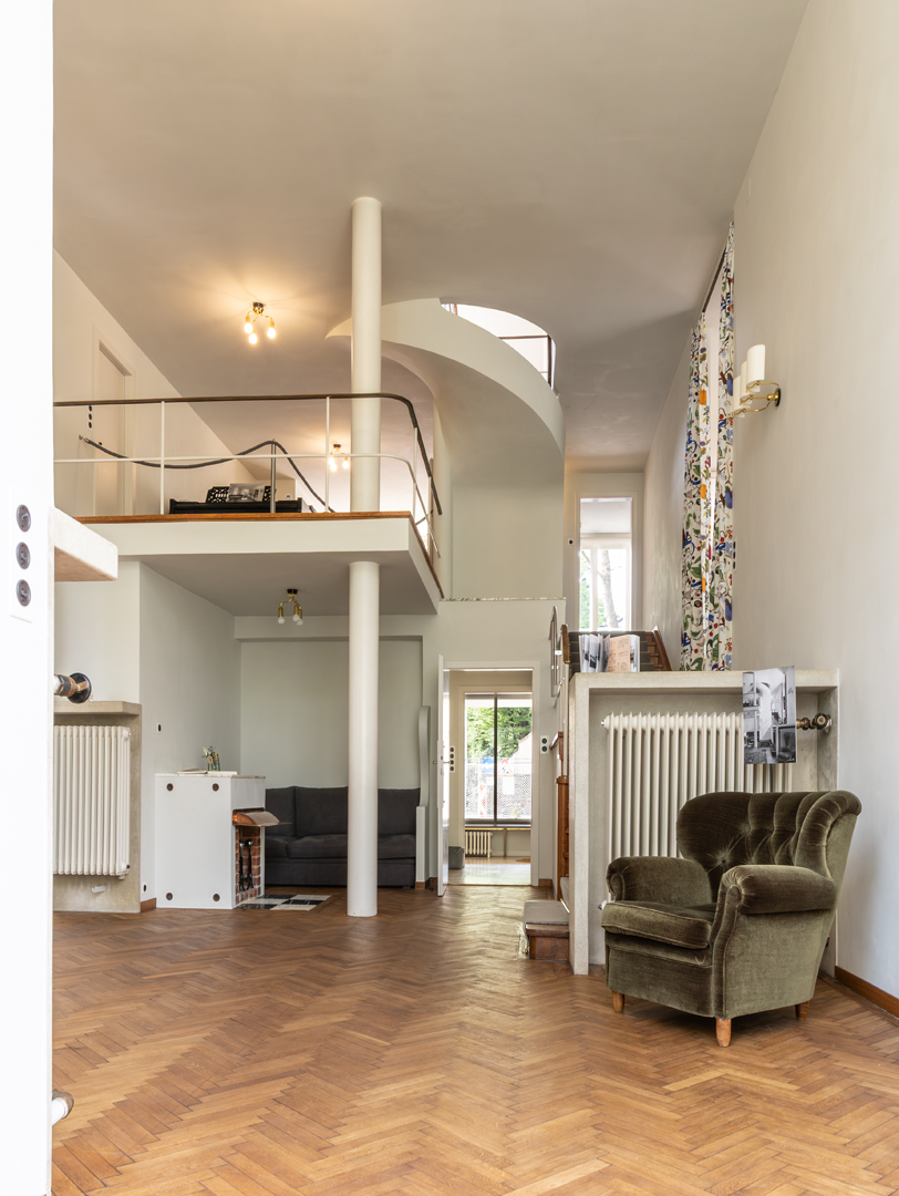 Die Raumabfolge mit unterschiedlichen Niveaus, Raumhöhen und Sichtachsen hinterlässt einen unverwechselbaren Eindruck. Vor allem die zweigeschossige Halle mit dem gartenseitigen Erker und der offenen Verbindung zum Musiksalon im Zwischengeschoß ist einzigartig. Die Hausherrin war Pianistin und konnte mit dem Spiel auf dem Bösendorferflügel den gesamten Wohnbereich beschallen.