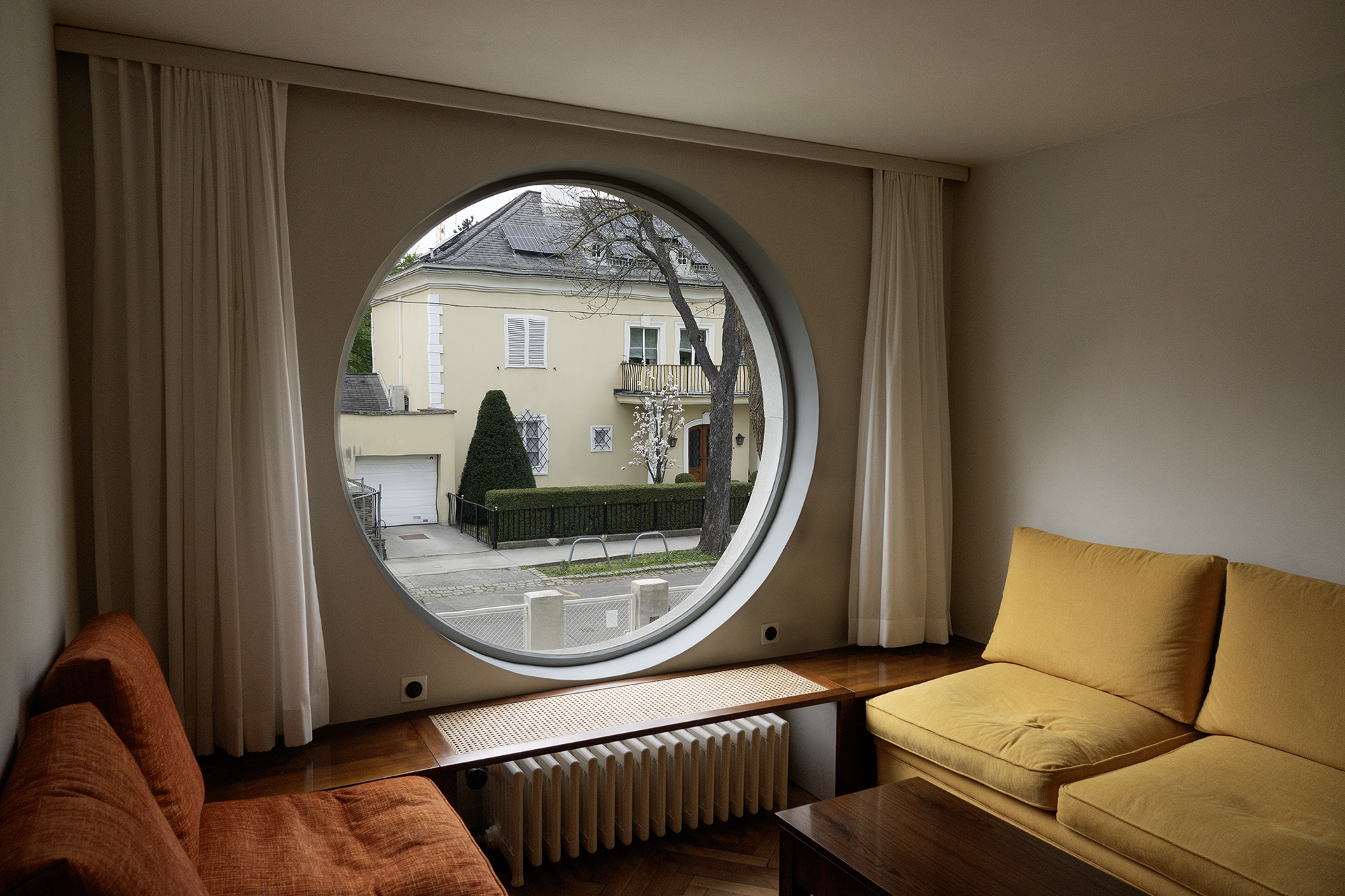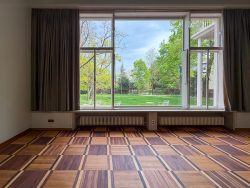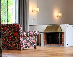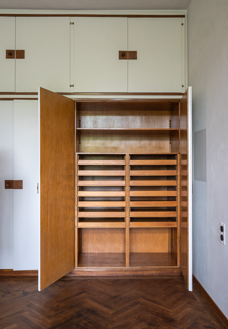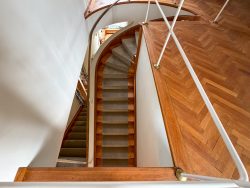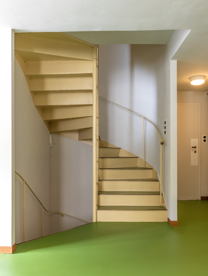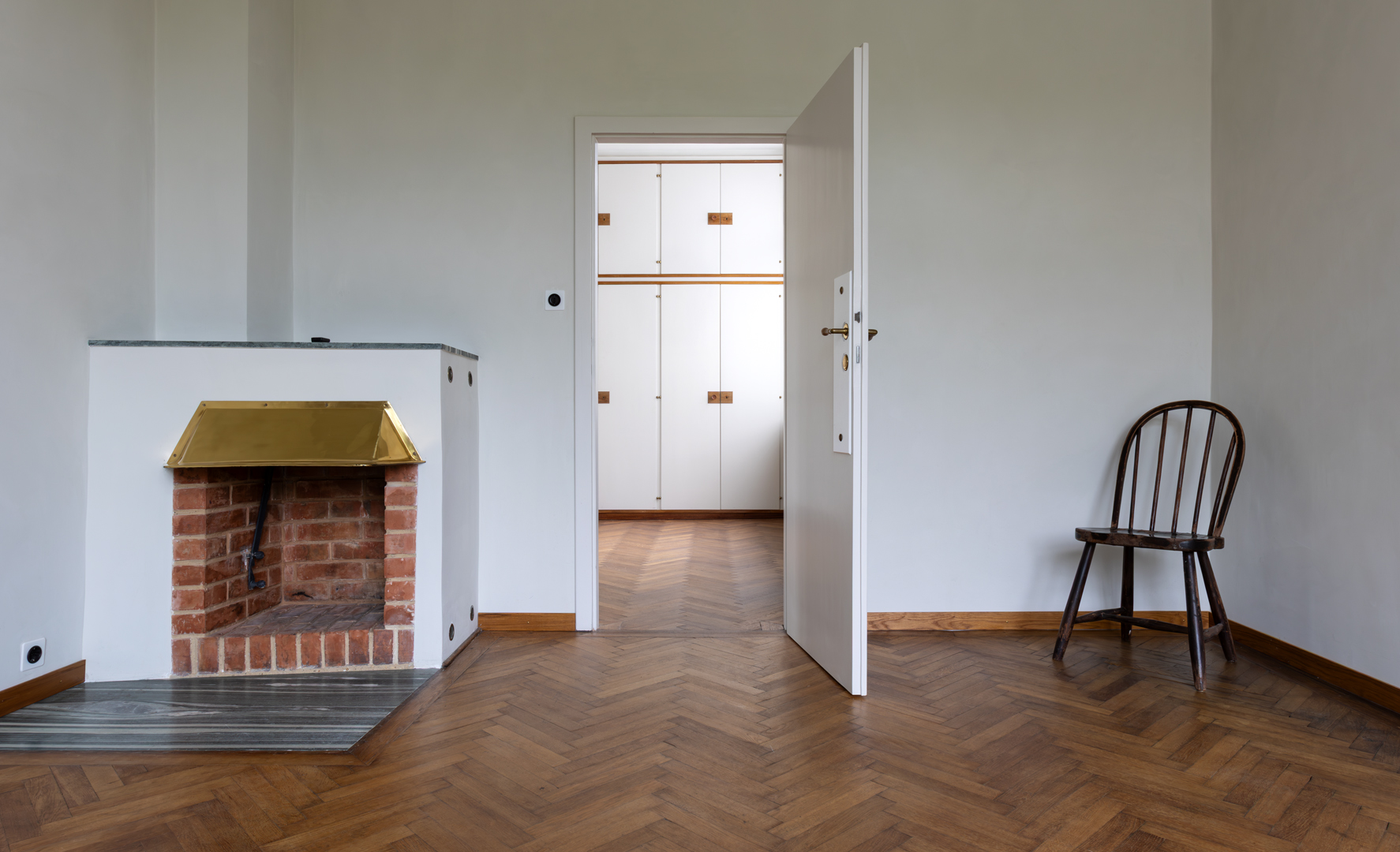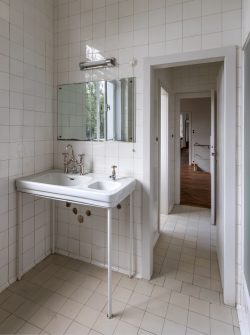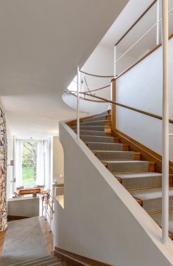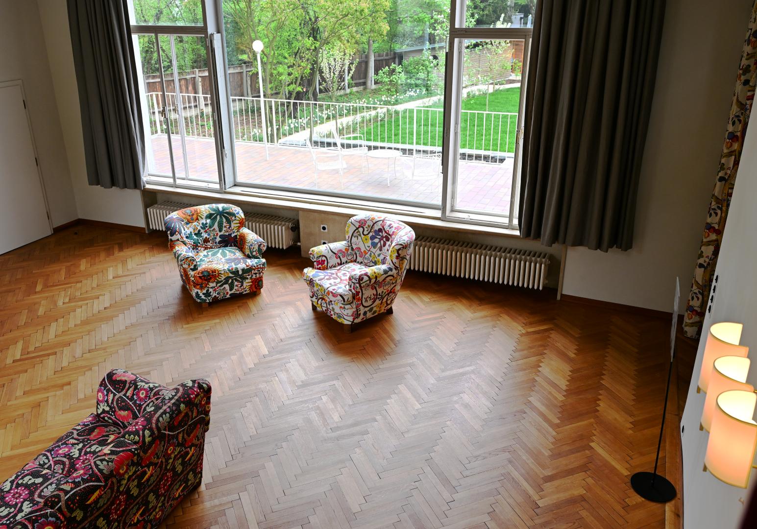 Vom Erdgeschoß bis zum Dachgeschoß wurden nachträglich eingezogene Wände entfernt, um die ursprüngliche offene Raumabfolge wieder erlebbar zu machen. Architektonische Details an den Fenstern, Fußböden, Kaminen, Radiatoren usw. wurden fachgerecht restauriert oder nachgebaut, wie z.B. die Lichtschalter im 3D-Drucker. Die sorgfältige Auswahl der Textilien für Vorhänge und Sitzmöbel ist beeindruckend.