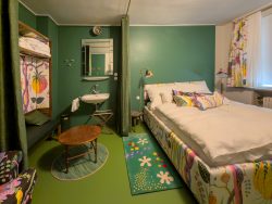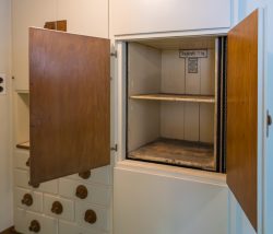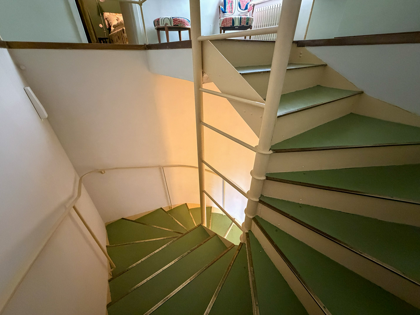 Auch die Schlafräume und Kinderzimmer im 1. Stock, von denen nur einzelne originale Schrankmöbel vorhanden sind, sowie den Dienstbotentrakt mit Küche und eigener Wendeltreppe konnten wir besichtigen.