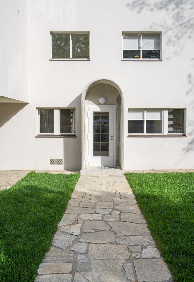 Die schmucklose Fassade besticht mit dem Erker, den Proportionen und den unterschiedlichen Fenstern in ihrem gestalterischen Ausdruck. Sogar der Schattenwurf der Bäume auf die weißen Wandflächen wurde berücksichtigt.