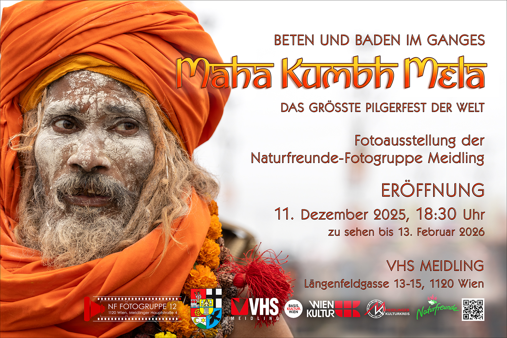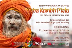 Die Ausstellung der Naturfreunde Fotogruppe Meidling zeigt Fotos vom größten religiösen Fest der Welt, dem hinduistischen Maha Kumbh Mela in Prayagraj in Nordindien, das heuer von 600 Millionen Gläubigen besucht wurde. Fünf Fotoklub Mitglieder reisten im Jänner zu diesem Pilgerfest.