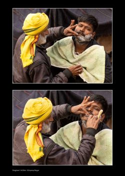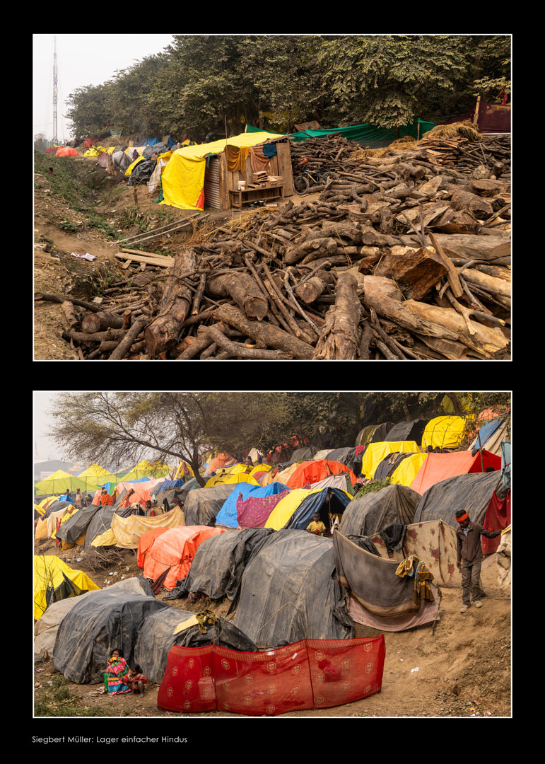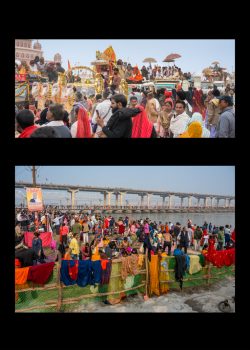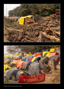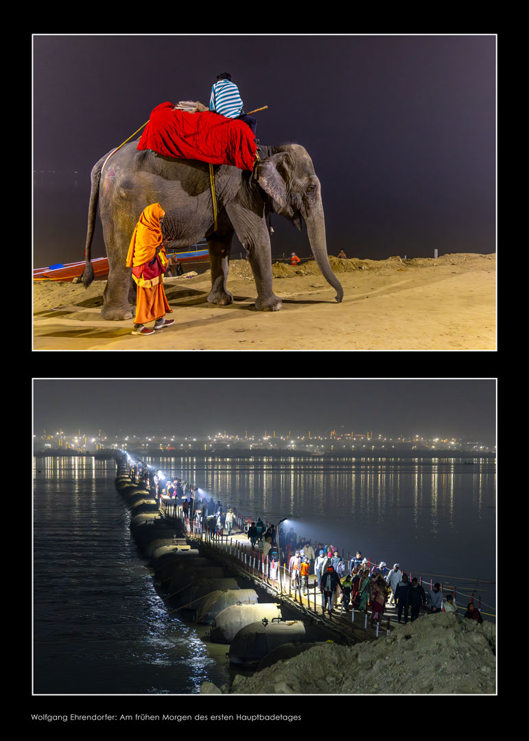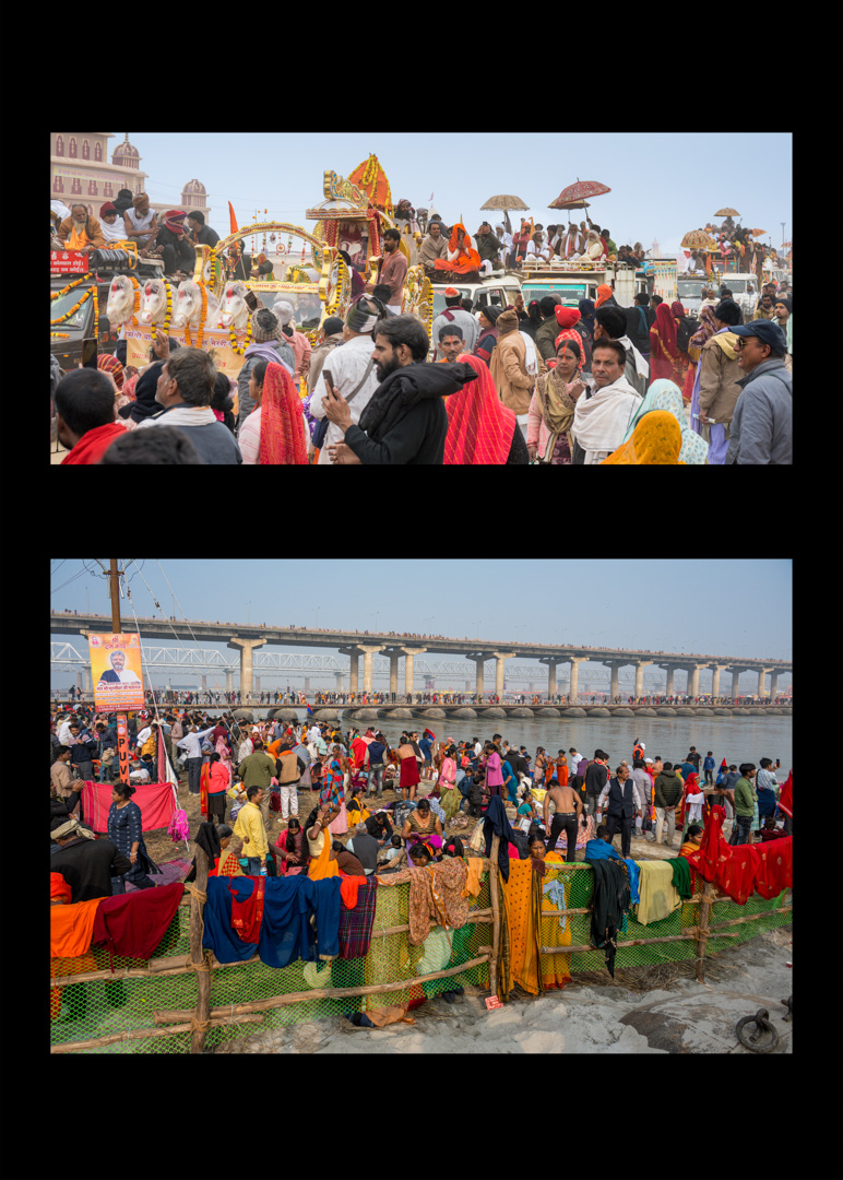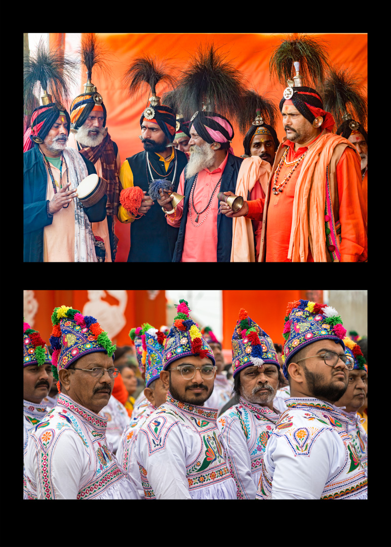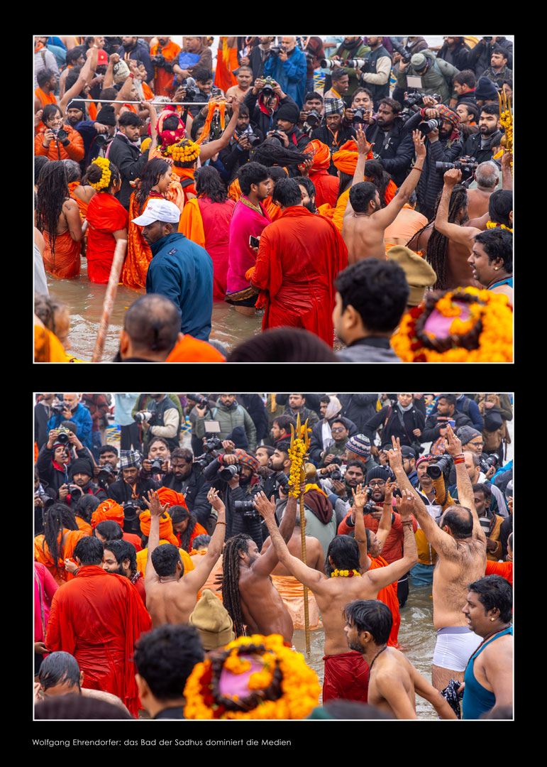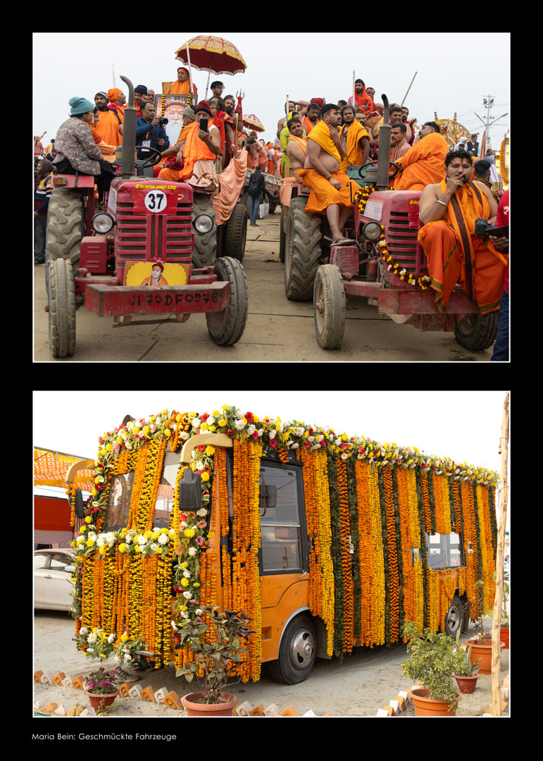 Sadhus – heilige Männer – halten Zeremonien ab und segnen die Gläubigen. In farbenprächtigen Prozessionen ziehen die Pilger:innen und Sadhus zu den Badestellen am Fluss. In temporär errichteten Tempeln werden Opferzeremonien abgehalten.